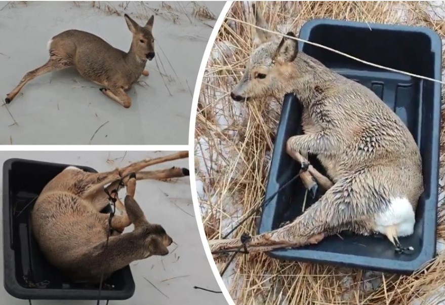 Животные кричали, при любой попытке встать, их копыта скользили, а ноги разъезжались в шпагате. В таких акробатических позах их и увидели наши герои. Мужчины не стали долго думать и начали переносить косуль туда, где начинался снежный покров и камыши.