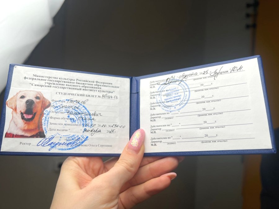 Снежок Валентинович Бычков, форма обучения очная, студенческий билет Самарского института культуры выдан в январе 2025 года. Вот что написано в официальном документе альма-матер для самарских музыкантов. Так простой лабрадор, который попал в семью Анны и Валентина по программе поддержки для незрячих, стал местной знаменитостью, - рассказывают «Вести - Самара».