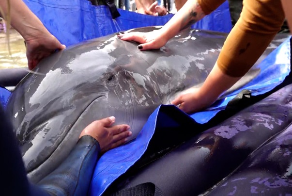 Афалину на берег эвакуировали в импровизированной лежанке – большой надувном матрасе. Из-за ран на коже и воды, где много патогенов, началось воспаление. Поэтому сразу выпускать животное в открытое море было нельзя.